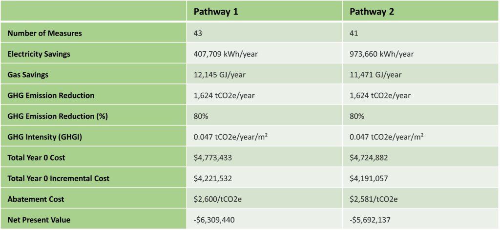 Note that the Net Present Value shown above does not include capital offsets from funding programs. There are several programs available, including the GMFs GHG Reduction Pathway Retrofit, which considerably offsets capital costs involved with implementing retrofits.